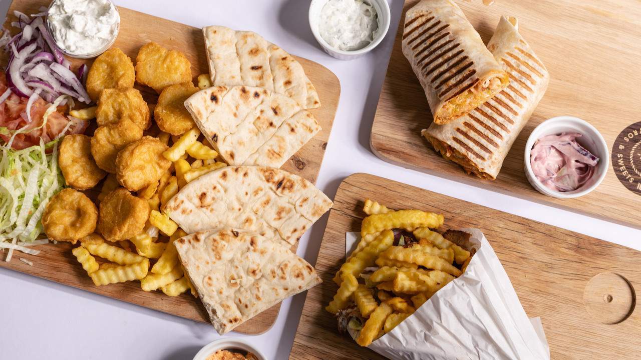 Pileće gyros meso 180gr, sir, salata, rajčica, tzatziki u tri grčke pite, pomfrit, 1 umak po izboru