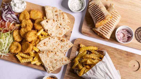 5 pilećih nuggetsa, pomfrit u grčkoj piti, 4 priloga po izboru