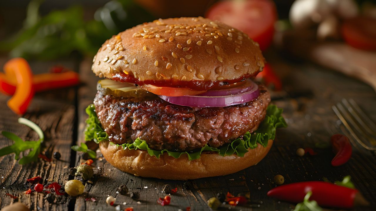 Burger 180 g, insalata, stracciatella, pesto, dischetto di mortadella piastrata, cipolla croccante