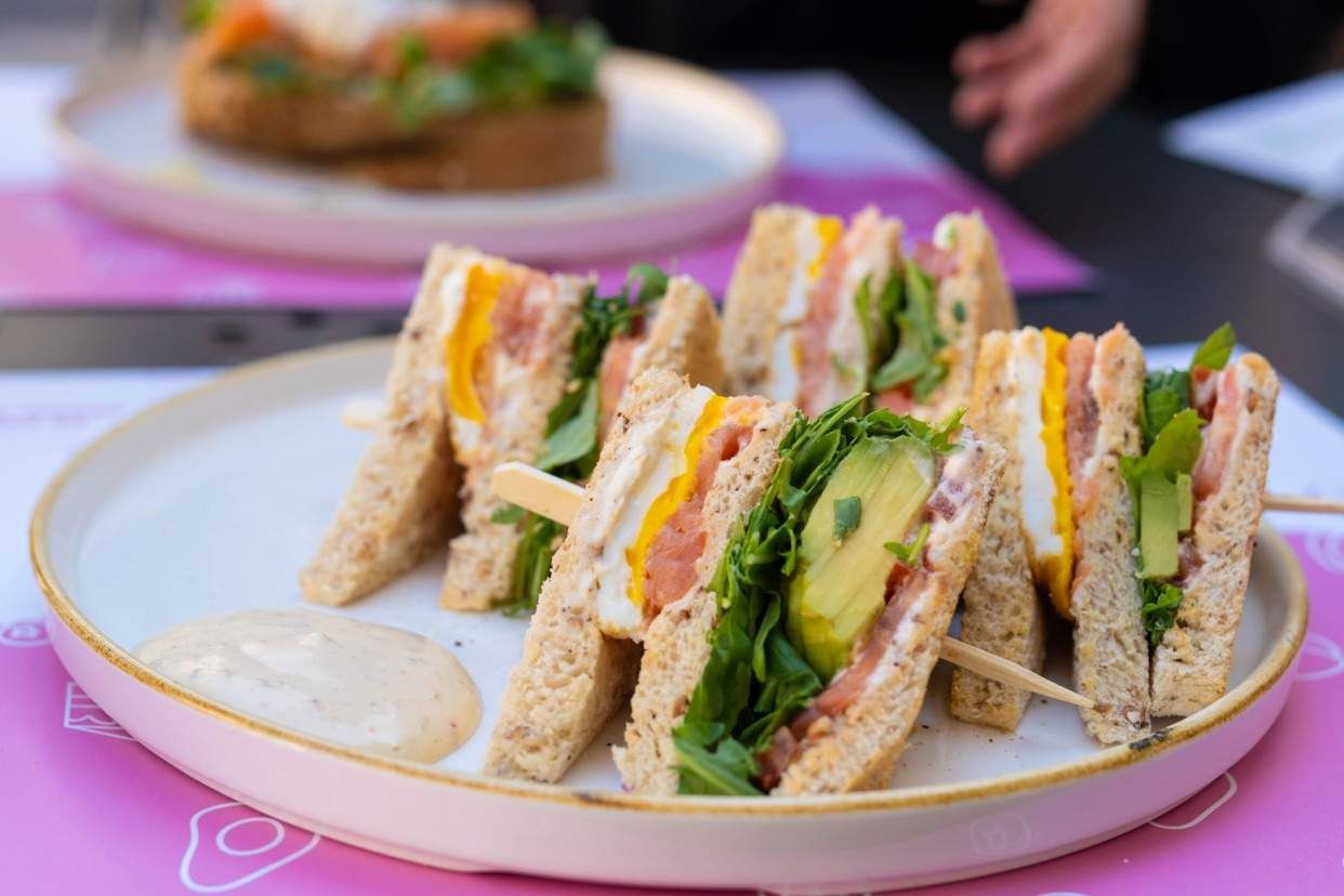Club sandwich con salmone affumicato, avocado,cream cheese, uovo all’occhio, pomodoro, rucola,servito con salsa brunch.Sandwich with smoked salmon, avocado, creamcheese, fried egg, tomato, rocket salad, served withbrunch sauce.