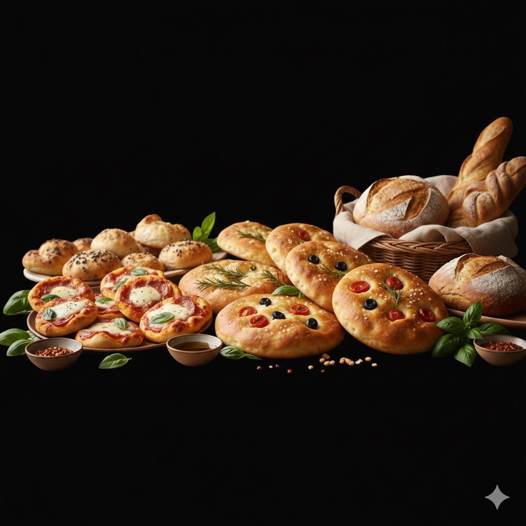 Focaccia secca, dorata e friabile, con salsa di pomodoro che le dona un gusto semplice e genuino, dal carattere Mediterraneo