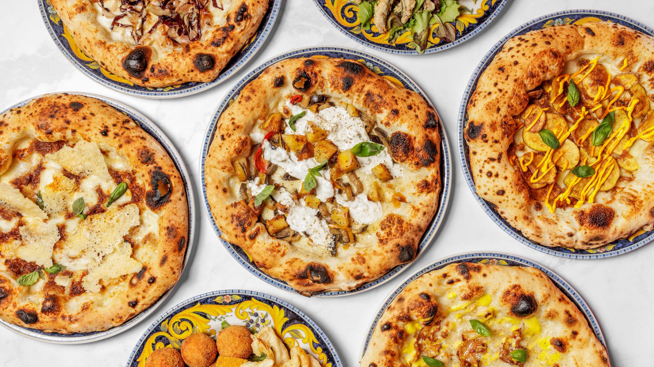 Pomodoro San Marzano, fiordilatte, funghi, carciofi, salame, in uscita prosciutto cotto arrosto, polvere di olive nere, basilico e olio Evo