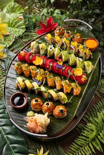 Salmone, tonno, pesce bianco, mango, avocado e mandorle, salsa della casa