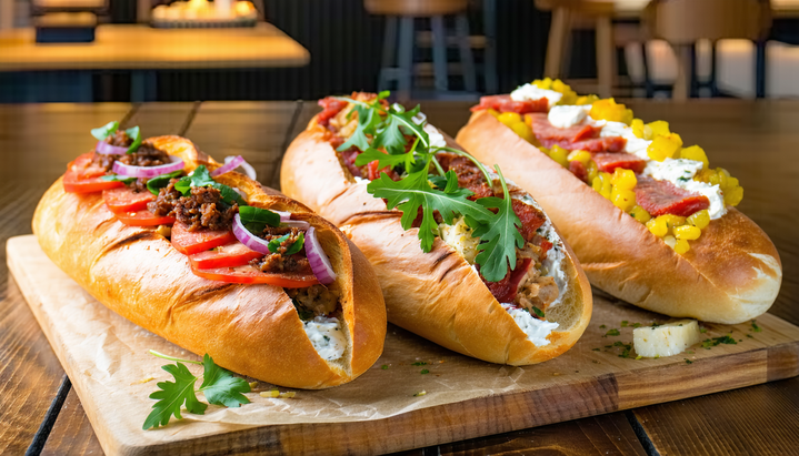 Pain panini, saucisse de foie, fromage, sauce, frites