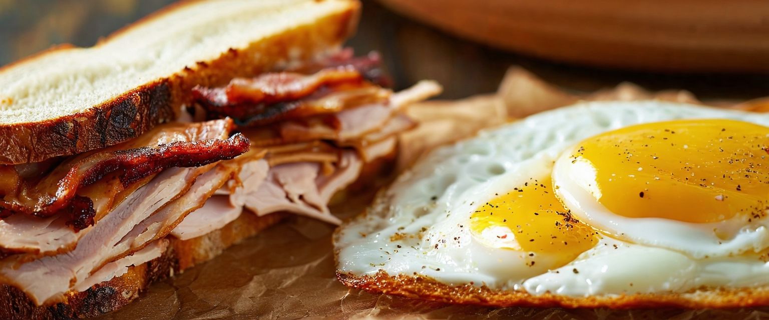2 Toasts grillés avec 2 œufs à la dinde et quesso + 1 jus d'orange, 1 boisson chaude au choix