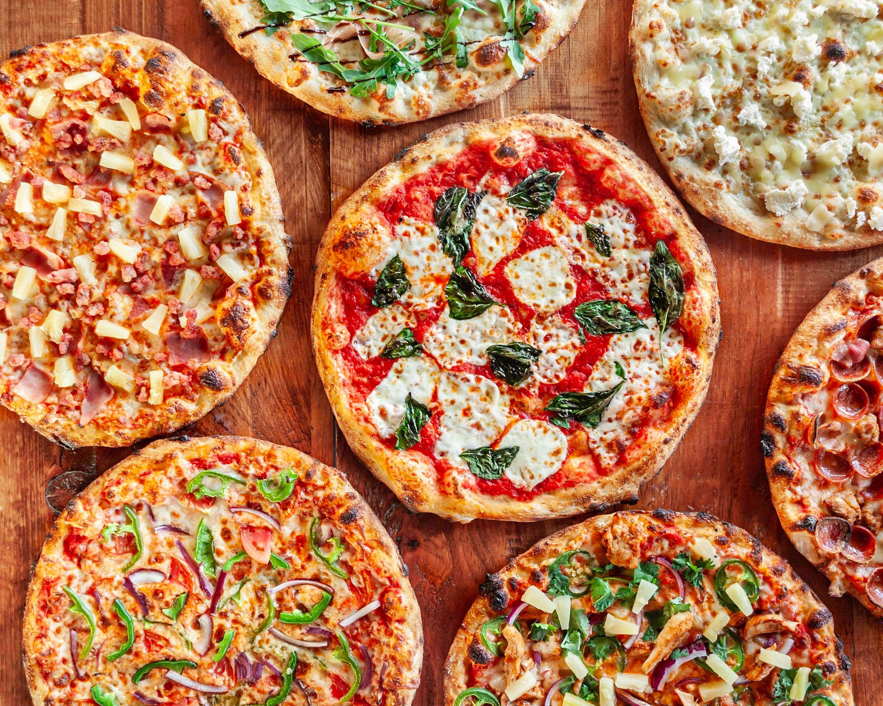 Crème parmesan, mozzarella, aubergines, courgettes, tomates cerises, épinards, champignons, roquettes, parmesan
