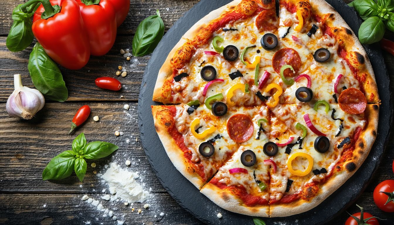 Sauce tomate, mozzarella, fruits de mer, poulet, viande hachée, légumes