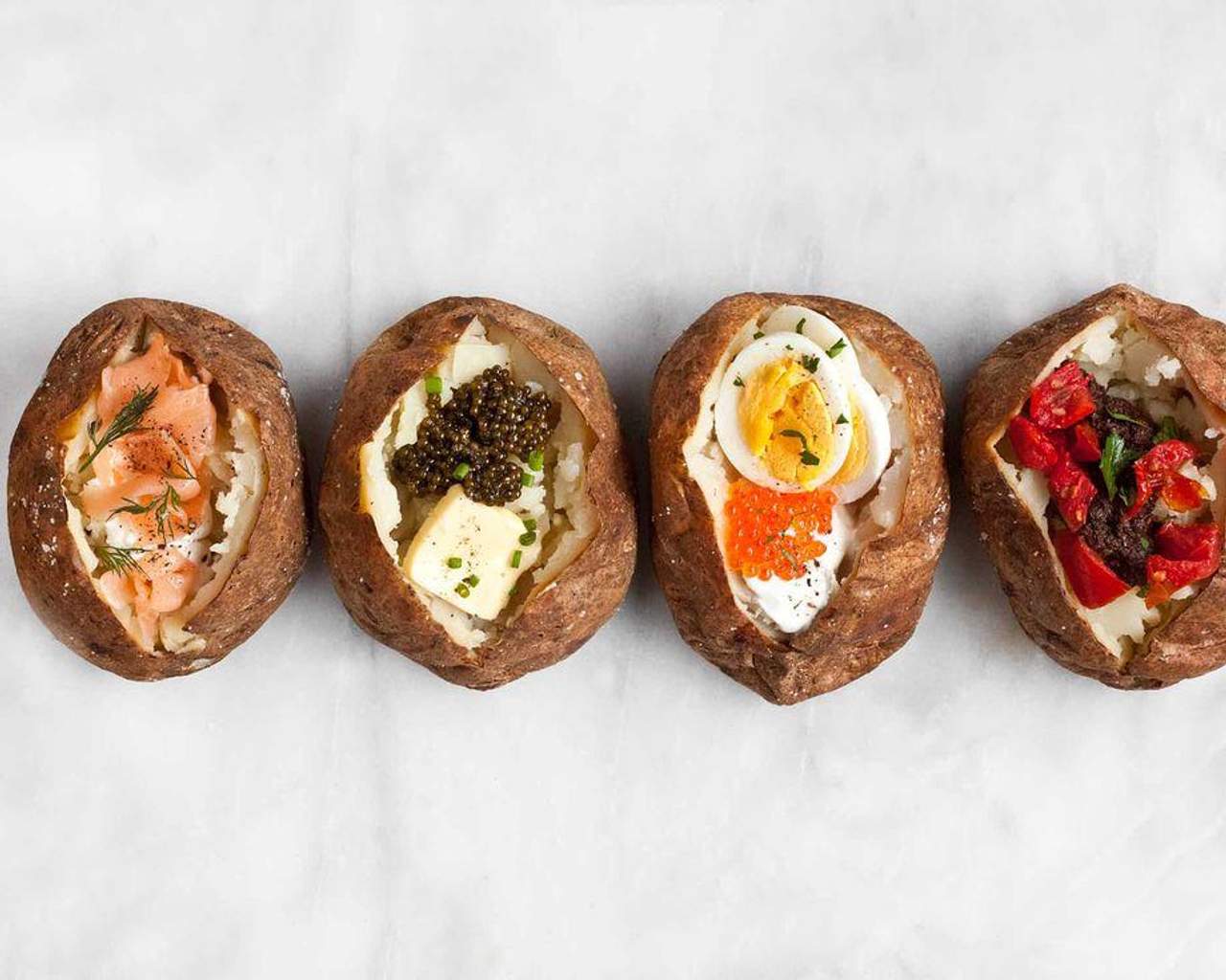 Pomme de terre cuite et farcie, poisson ,dinde fume ,poulet,viande hachée , salade au choix, sauce