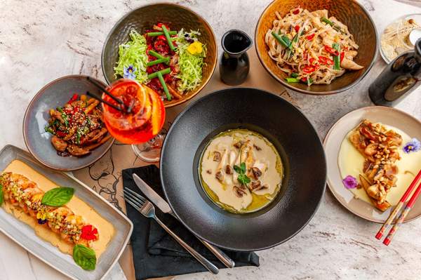 Bulion dashi, ghimbir, lime kaffir, langostini, creveti tigru, rosii chery, coreandru si orez condimentat