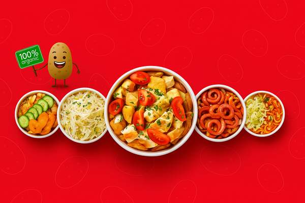Cartof copt, crenvurști vienezi prăjiți, morcov picant, sos de usturoi, sos roșu, muștar, ceapă crispy, condimente, ulei de măsline - 500 g