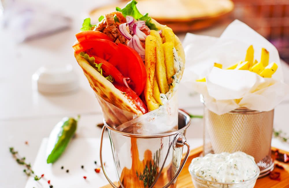 Frigarui cu carne de porc sau de pui la grătar, rosii, tzatziki, cartofi fri, pita - 400g