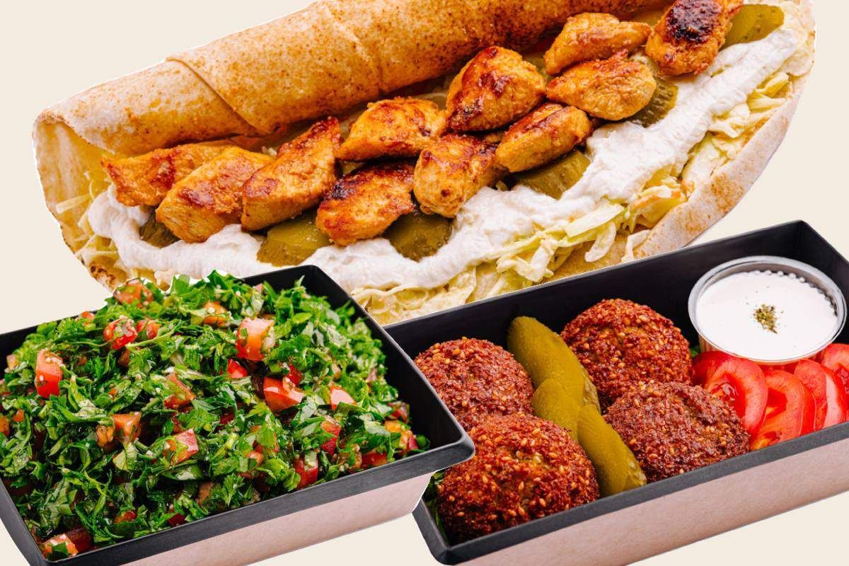 Lipie cu kebab din carne de vita si berbecut iute condimentate, pasta de usturoi, hummus, salata verde, rosii, muraturi.-470 gr.