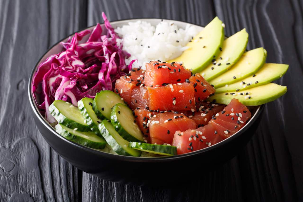 Ton, orez, avocado, roșii cherry, castravete, ou fiert, ghimbir murat, piersic, susan, microplante, sos de mango, sos Aioli, sos de soia - 390g
