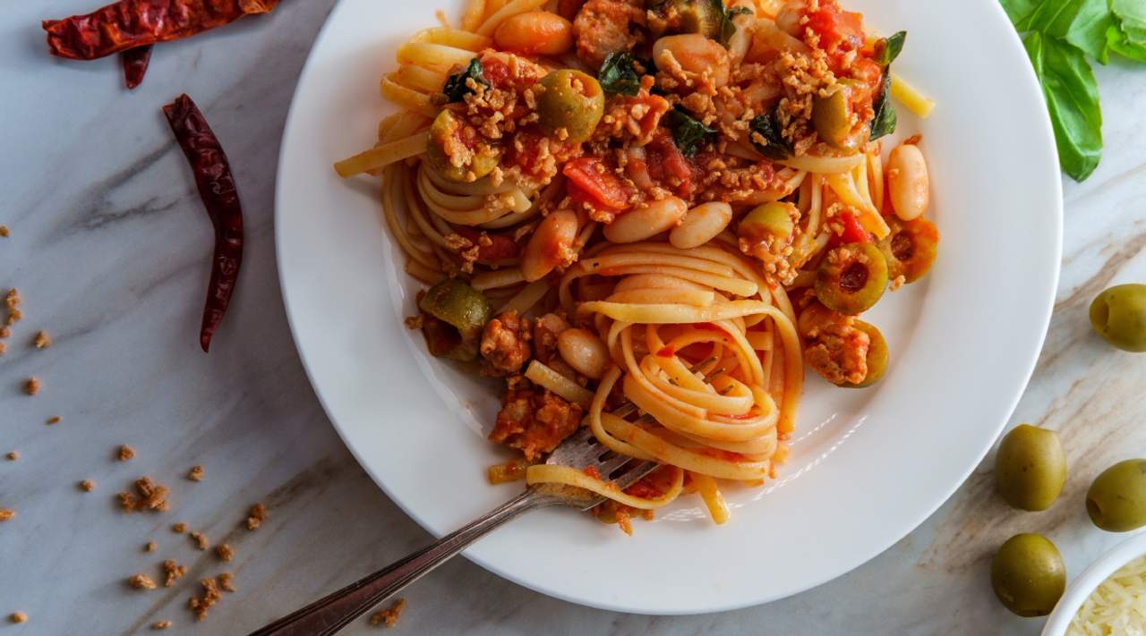 Taglietelle,olive, roşii uscate, vînǎtǎ ,ardei dulce, piper, sos de roşii, parmezan 350g