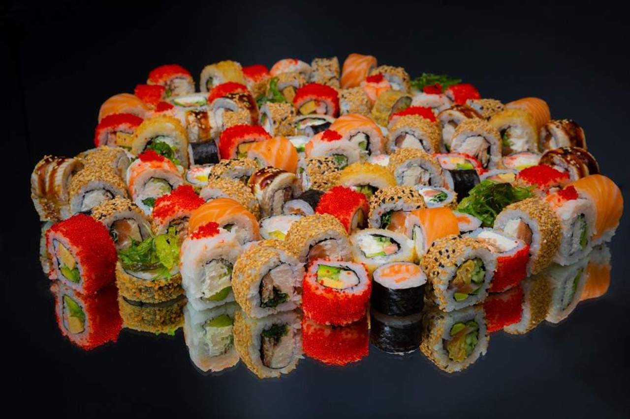 Orez, nori, cremă de brânză, avocado, somon, icre tobico, panco, sos unagi, sos spicy.