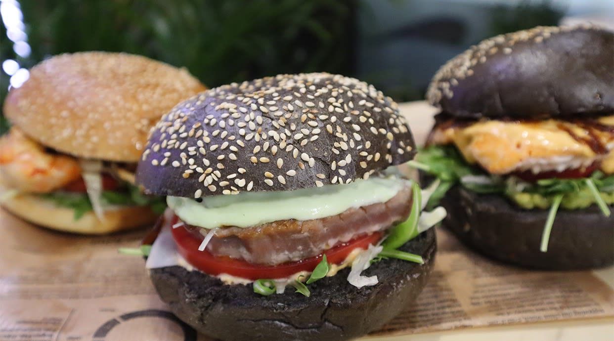 Crni burger ban, crveni i bijeli kupus, soja sos, tuna steak, parmezan, chips od kapule, rukola, jalapeno sos