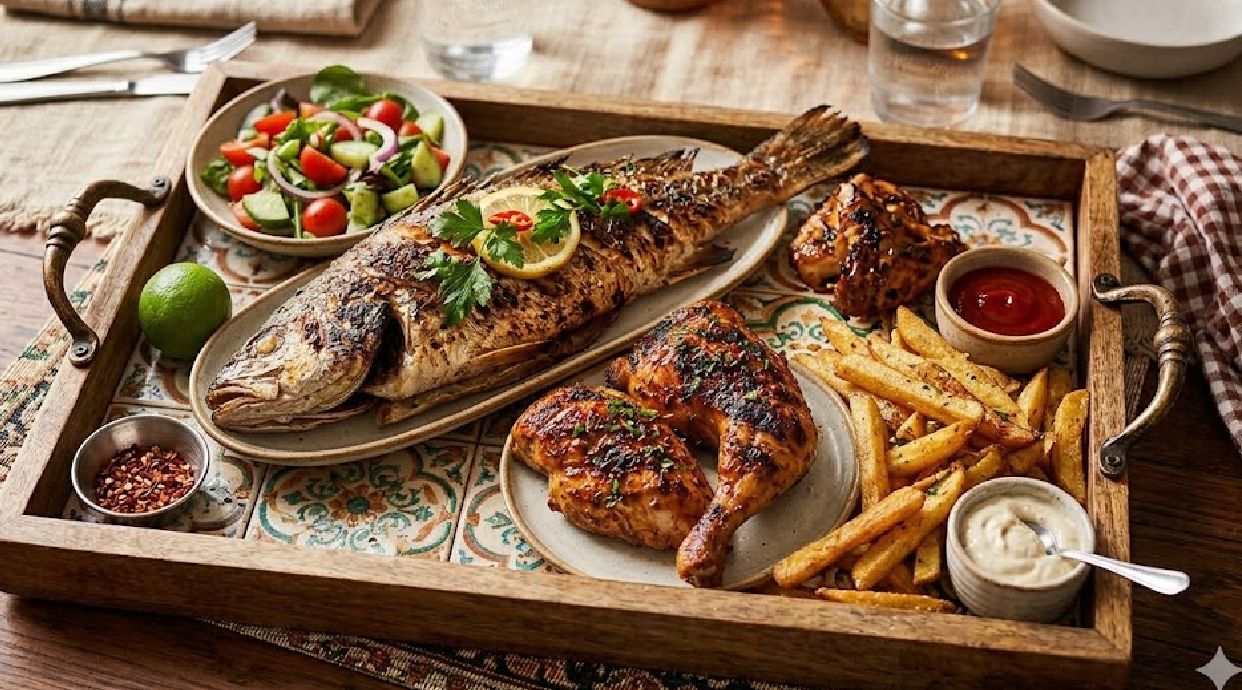 Freshly grilled Croaker fish, perfectly seasoned and served with chips.