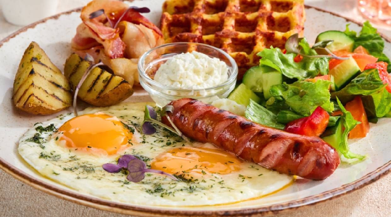Oven fresh Waffles of Oat flour batter with fruit toppings, grilled Sausages, Baked Beans, Fried Egg & Airfried Turkey