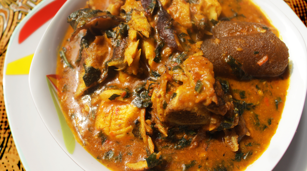A rich Nigerian dish made with afang leaves, vegetables, meat, and fish, cooked in a flavorful broth