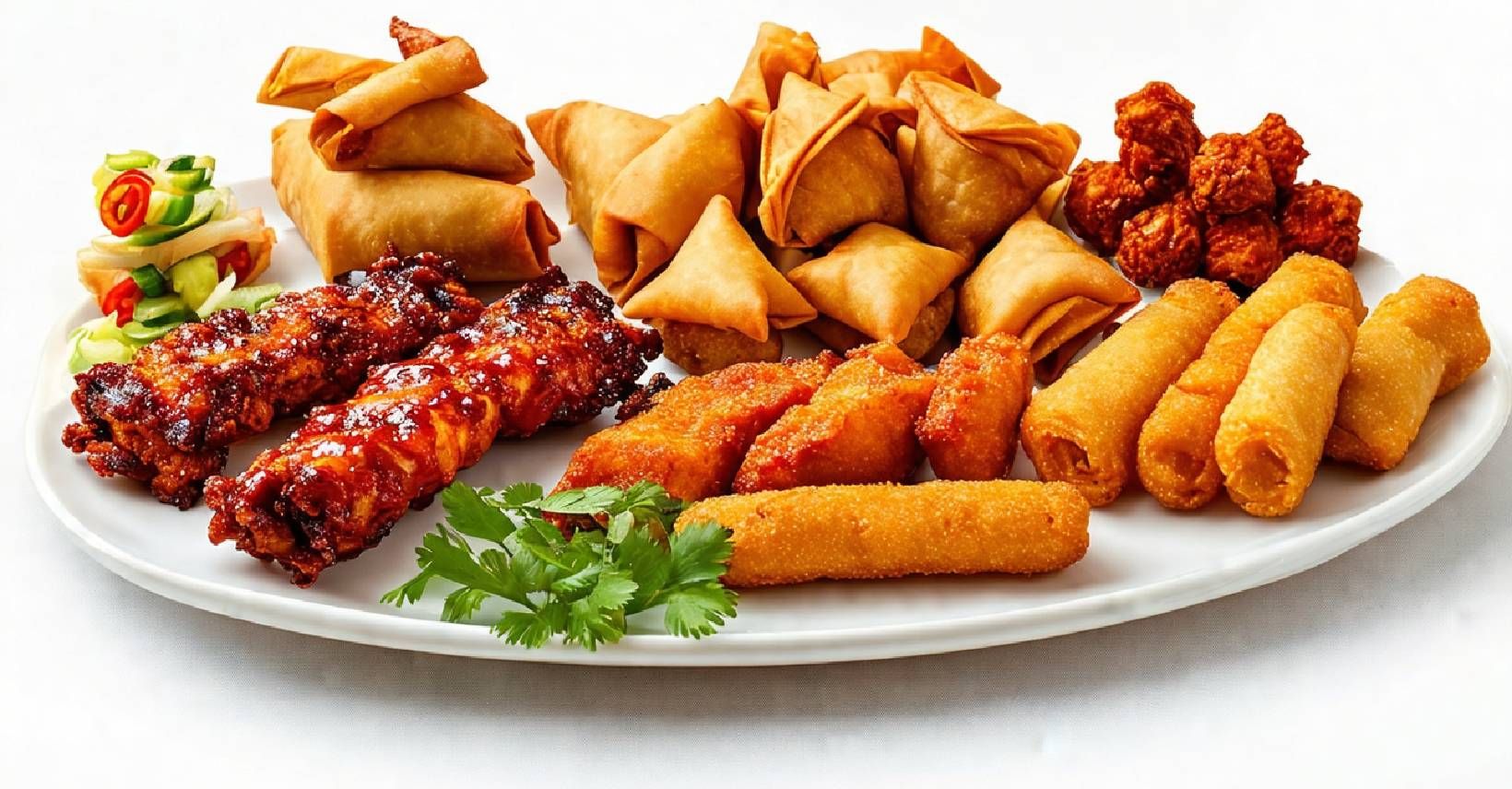 1 Spring Roll, 1 Samosa, 1 BBQ Chicken, 4 Puff Puff, 4 Mosa