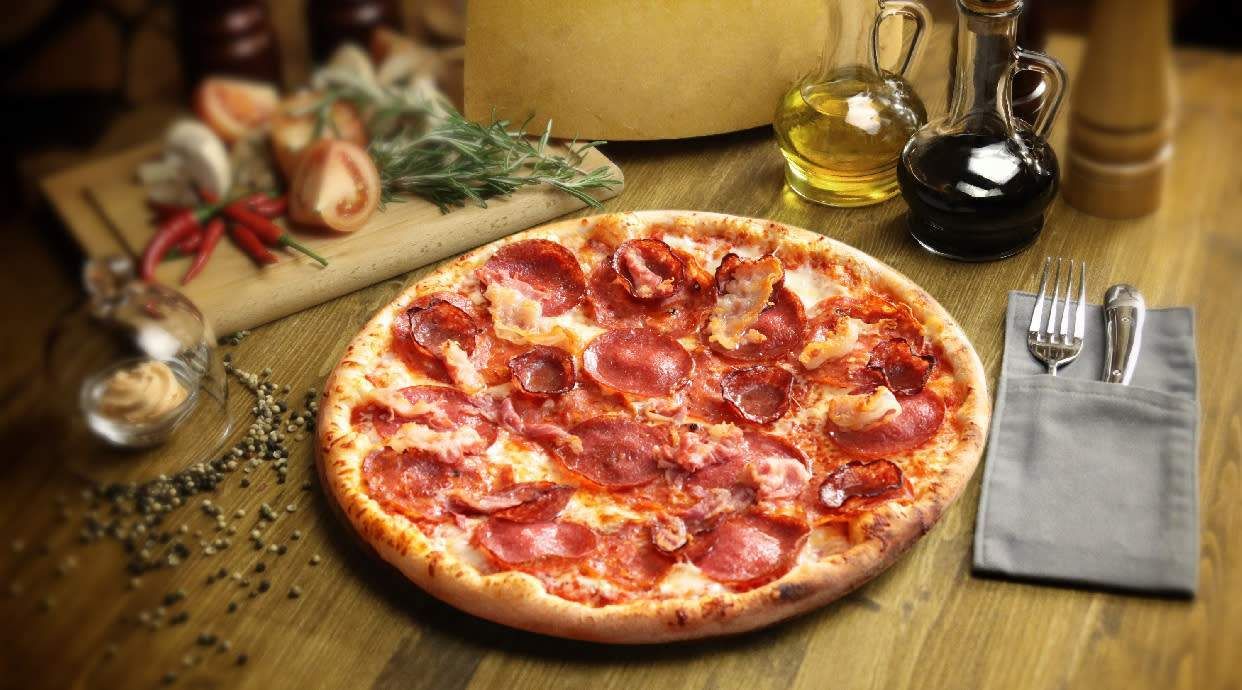 Sos pomidorowy pikantny, Ser mozzarella, Oregano, Salami, Boczek, Cebula, Szynka, Kabanos
