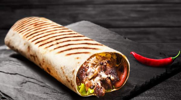 Bez sałaty, mięso kurczak lub woł-baranina lub mix, cienki chleb pita, sos, pasta czosnkowa Zdjęcie poglądowe*