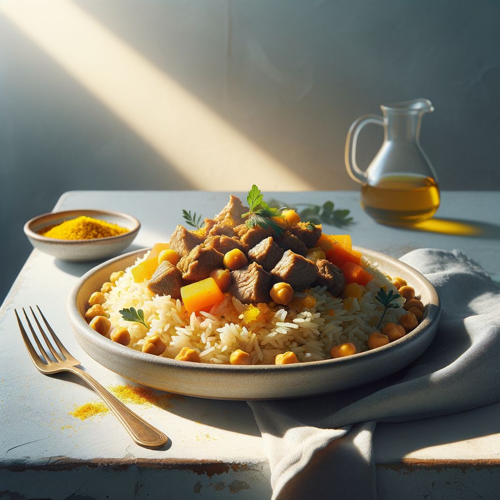 Aromatyczne danie z ryżu, baraniny i marchewki gotowane na wolnym ogniu