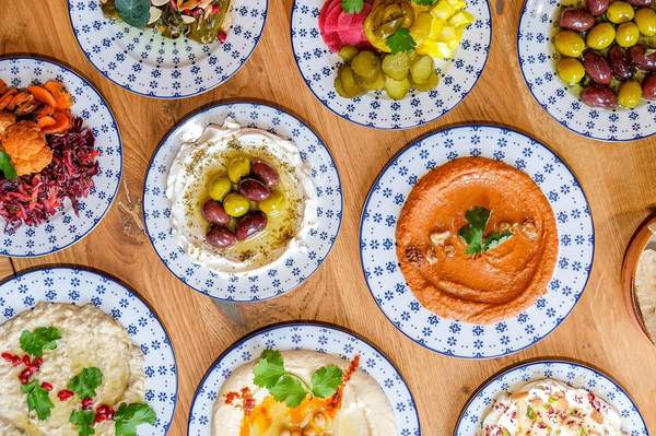 Hummus z wegańską shawarmą, pomidorami, pestkami granata, zestawem pikli, sałatką i pitą