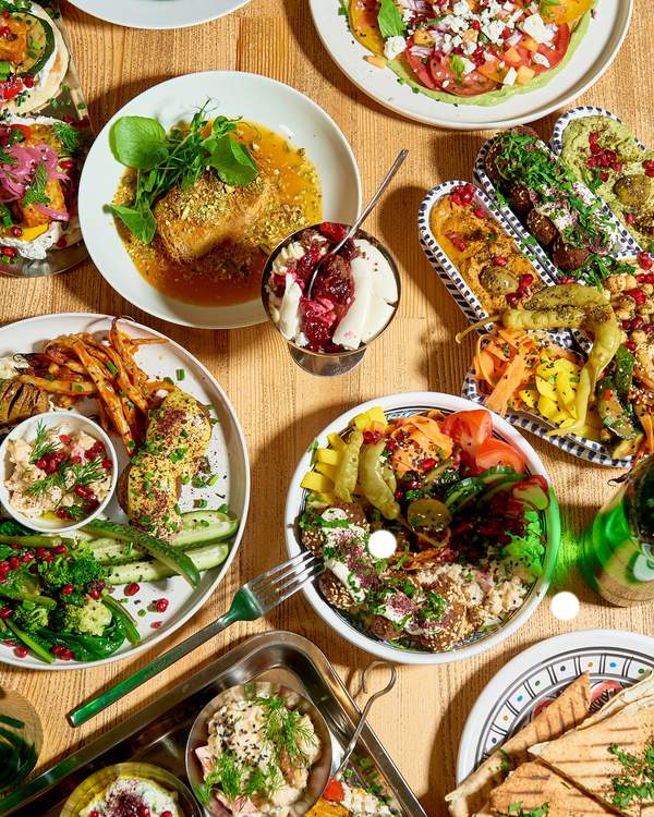 KREMOWY KLASYCZNY HUMMUS / FALAFELE Z SOSEM ORZECHOWYM / POMARAŃCZOWO-KOLENDROWA PIKLOWANA MARCHEWKA / KALAREPA / CHRUPIĄCE OGÓRKI Z CHILLI I OLEJEM SEZAMOWYM / FASOLKA SZPARAGOWA / COLESLAW Z KALAFIORA / ŚWIEŻE WARZYWA / OLIWKI / PAPRYCZKI LOMBARDI / PITA ARABSKA