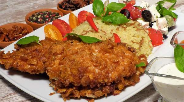 Polędwiczki z kurczaka panierowane płatkami kukurydzianymi (250g). Danie podawane z zestawem surówek.