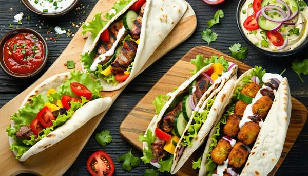Kurczak, wołowina lub falafel, surówki, frytki, ser, sos