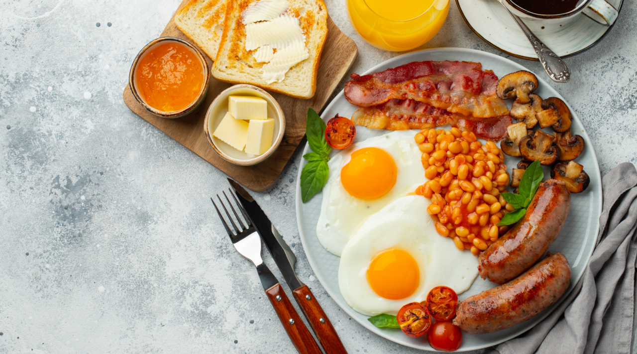 Jajka, kiełbaski, boczek, fasolka, pomidory, pieczarki i mikroliście, podane z chrupiącym pieczywem (2 szt)