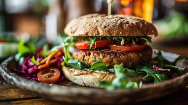Beyond Burger, chutney rabarbarowy, pomidor, cebula czerwona, sałata, ketchup z cukin i
