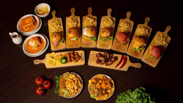 Pão com sementes papoila, alface, tomate, hamburguer 100% carne de vaca,nachos, molho picante,queijo cheedar e batata frita