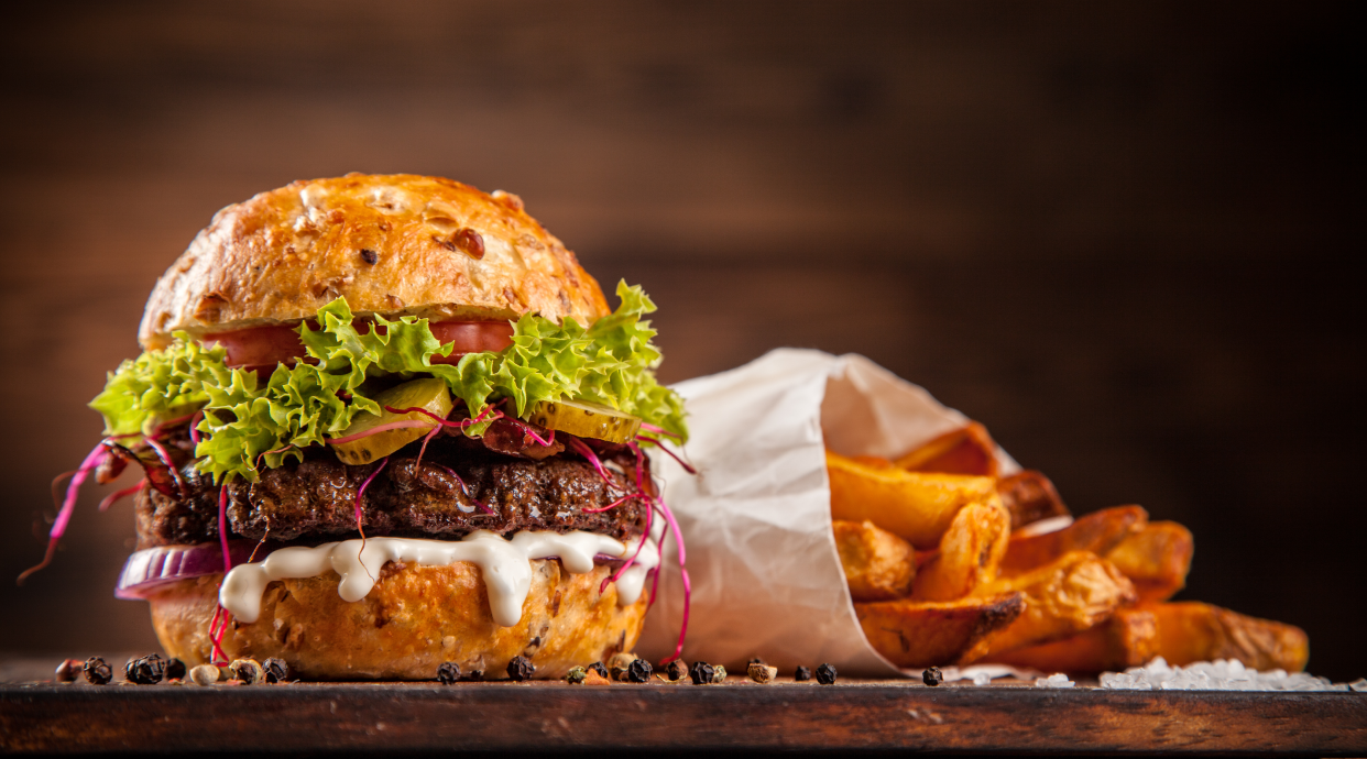 Pão brioche, dois hambúrgueres bovinos, bacon, queijo cheddar, cebola caramelizada, molho especial