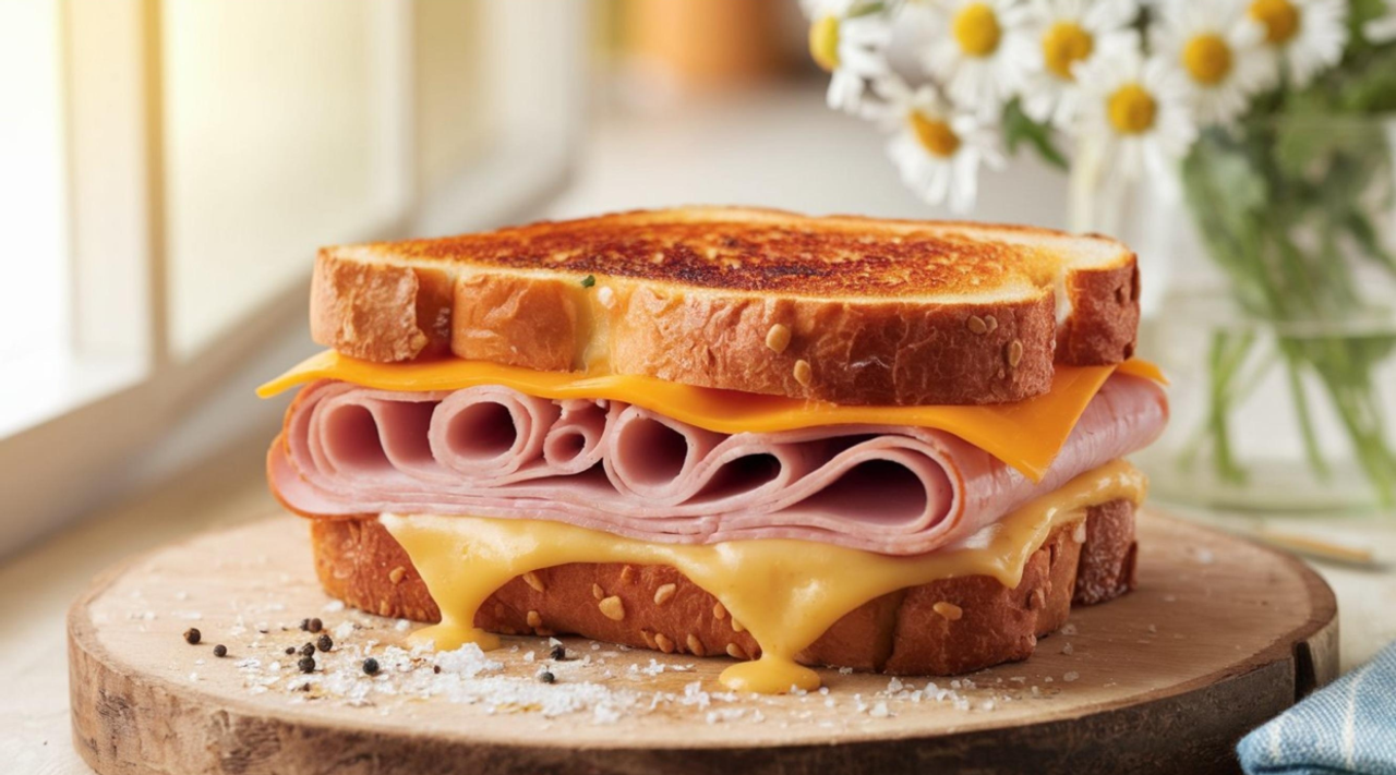 Hambúrguer de alcatra, presunto, tomate, cebola roxa, maionese de alho e coentros. Inclui batatas fritas e molho para batatas.