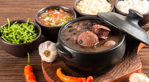 Feijoada brasileira ,farofa ,couve picada ,arroz ,vinagrete