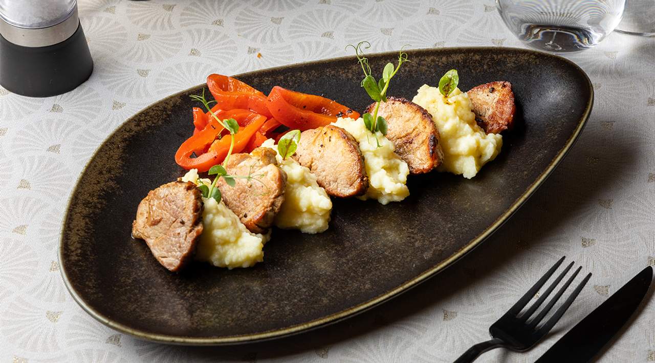 Mușchiuleț de porc cu piure și salată de ardei copt