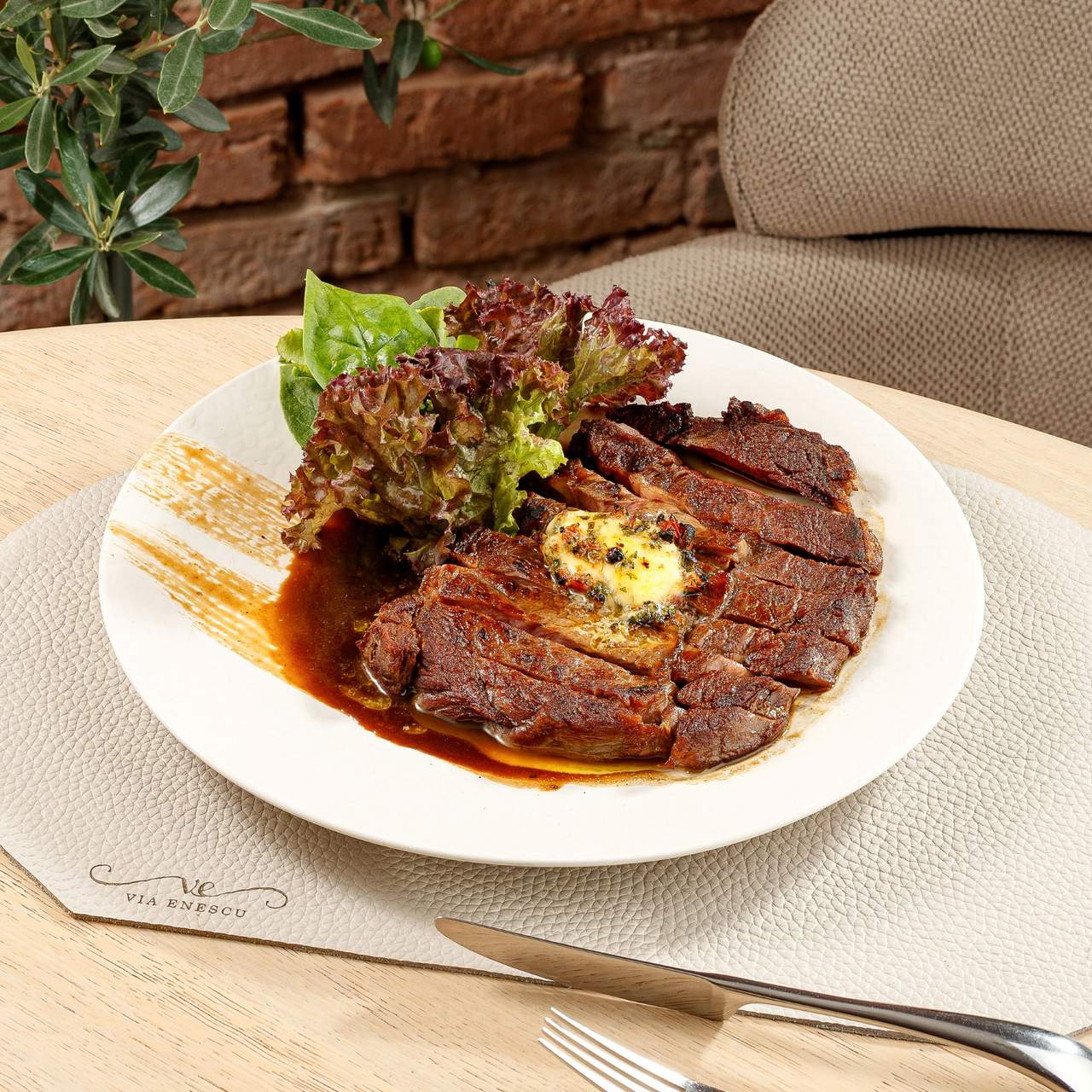 Mușchi de vită, mix de salată, sos demi-glace, unt mărar, french - 300g