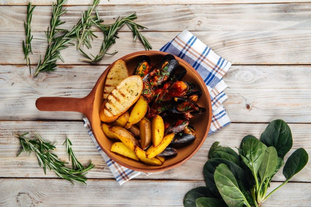 Midii, unt, usturoi, ceapă roșie, vin alb, pită grecească - 1kg