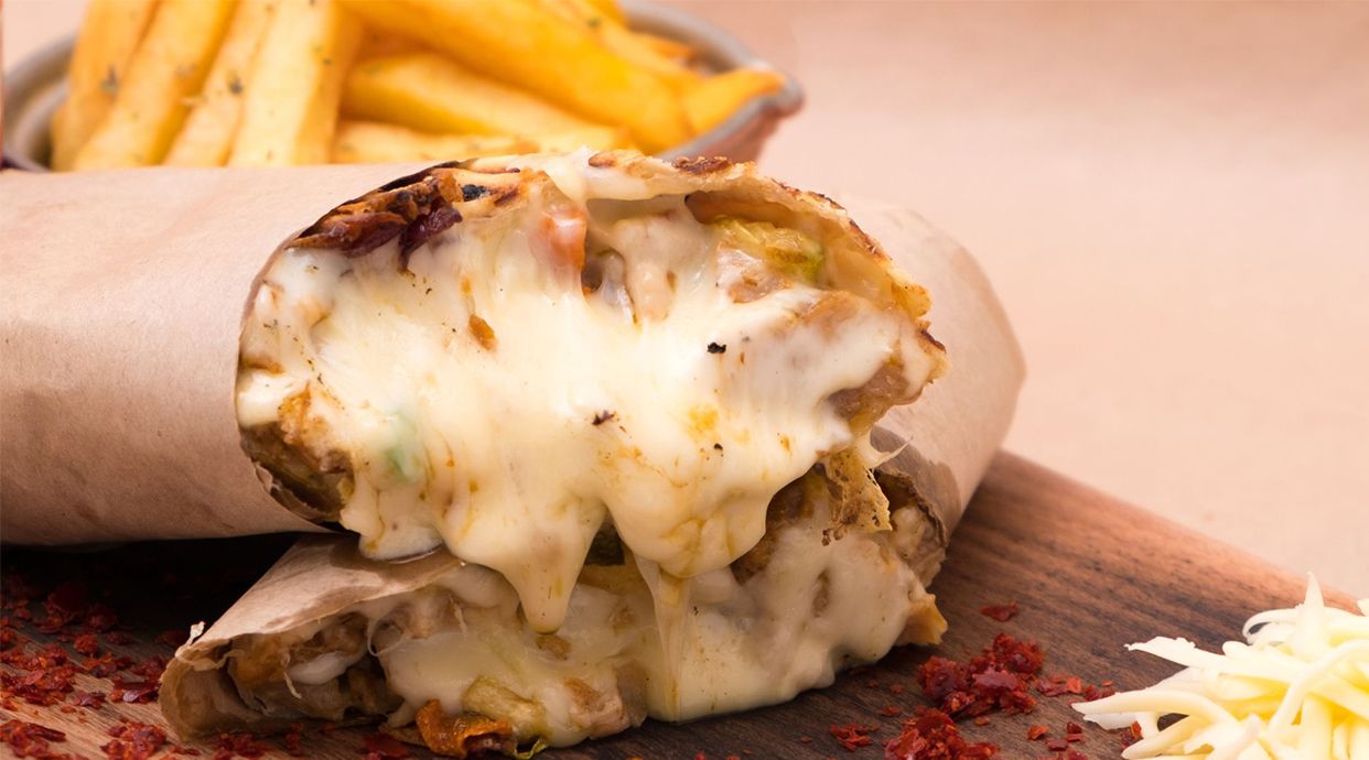 Lipie Tortilla, Cascaval, Cartofi Prajiti, mix Legume Calite ( ardei kapia, dovlecei, morcovi ), Castraveti Murati, sos Artizanal Maioneza cu Usturoi, sos Rosu Artizanal la alegere ( dulce, mediu picant sau picant ) – 510g Produsele din imagine sunt cu titlu de prezentare.