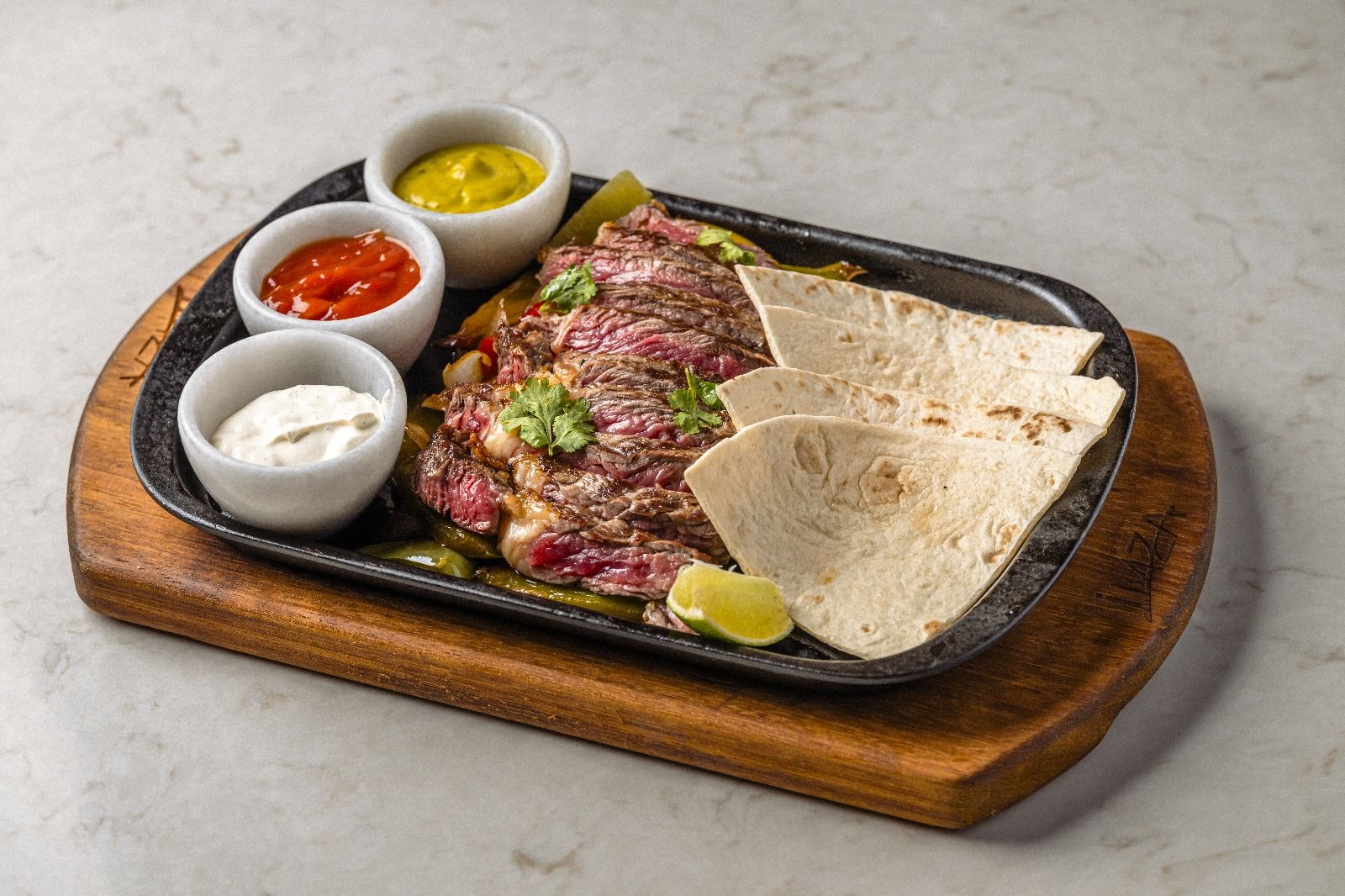 Mușchi de vită la grătar, lipie, ceapă, ardei, coriandru, lime, tortilla, smântână, guacamole, sos de soia, boia dulce, piper, sare - 500g