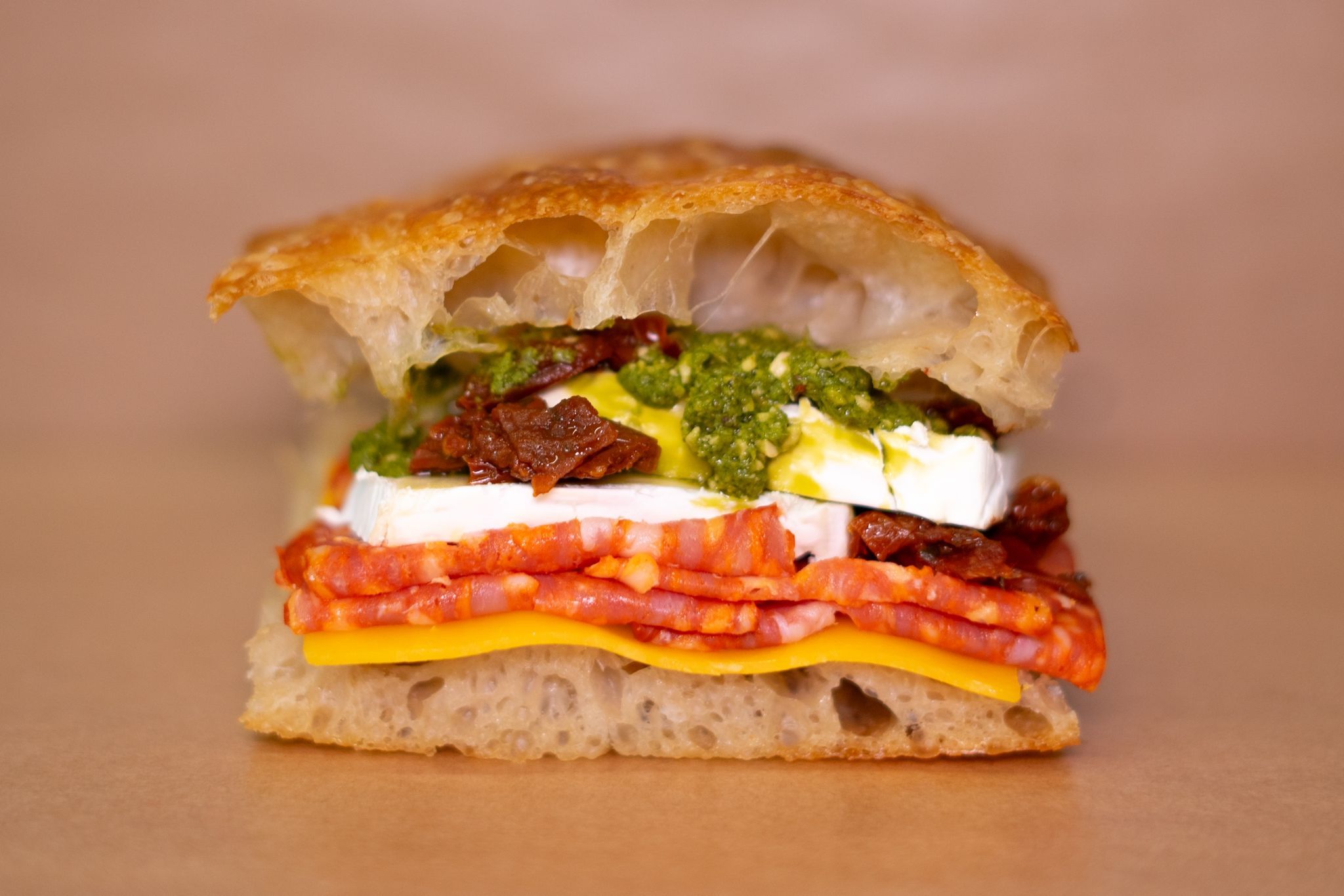 Focaccia, salam picant, brie, rosii uscate, pesto, crema de branza - 220g
