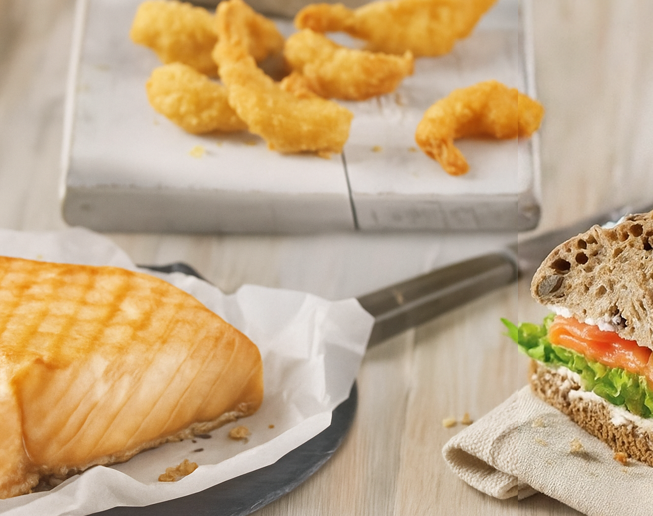 3 creveți pane (30g), 3 crochete de pește Alaska-Pollock (65g); cartofi prăjiți wedges (130g). Pește de captură certificare MSC și creveți ASC.