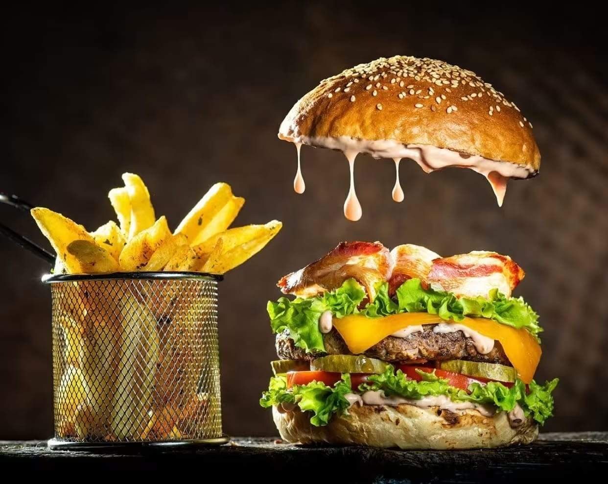 Chiflă, carne tocată din antricot de vită, salată, pancetta, caș cheddar, roșii, castraveți murați ,inele de ceapă, cartofi prajiti ultra crocanti, sos rose 350g/150g/50 g