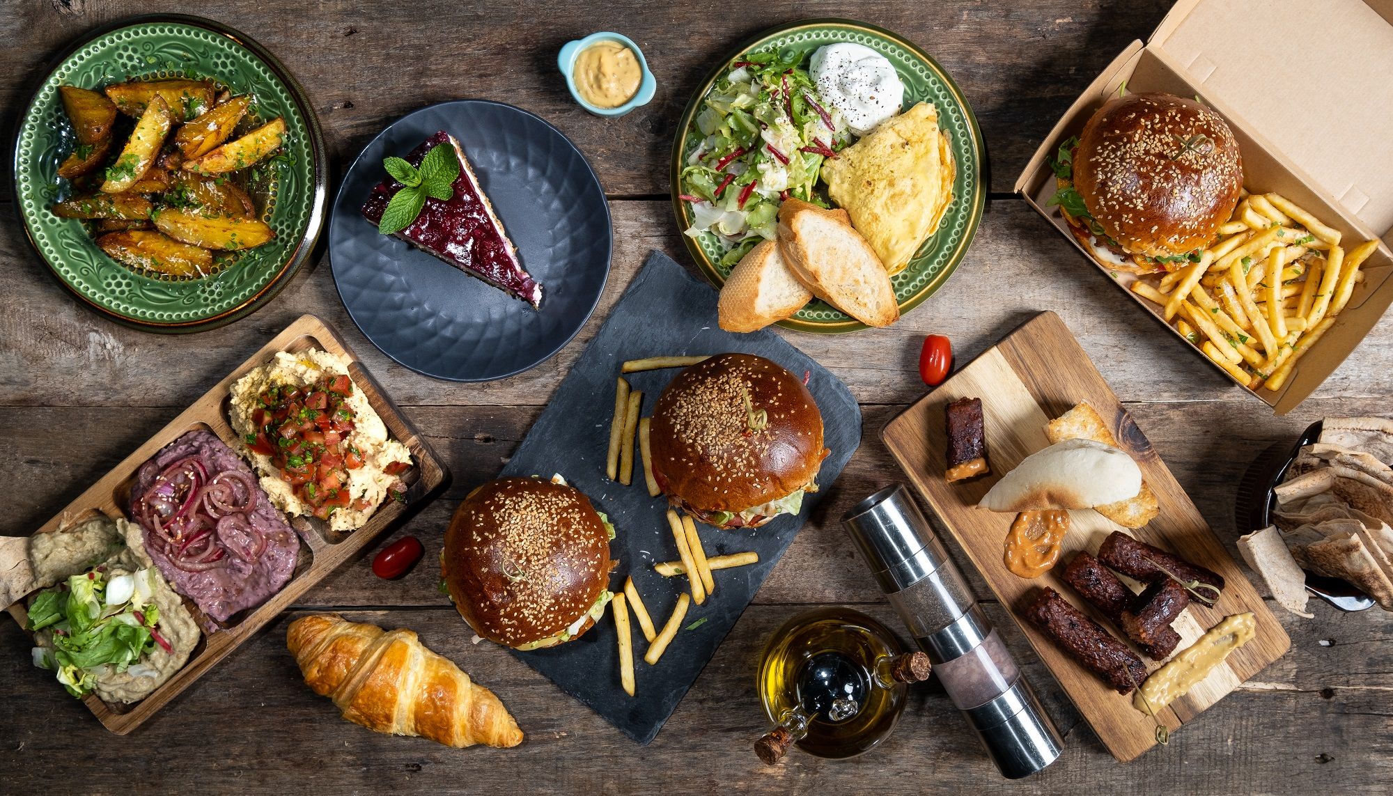 Meniul conține un S.S.B.D burger: chiflă, carne din proteină de mazăre, brânză cheddar, maioneză vegană home-made, sos Bbq, rucola și felii de roșie zemoasă și o porție de cartofi pai cu parmesan, sos de usturoi si pătrunjel verde - 490g