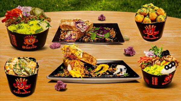 Box sățios: cartofi pai, vita black angus, ardei capia copti, castraveti murati, ceapa rosie, telemea, sos usturoi — 400g