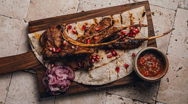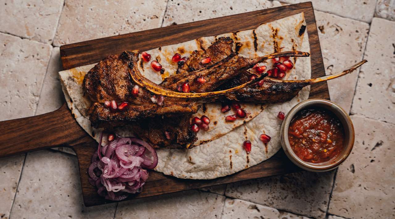 Coastele de porc sunt glazurate cu sos Tkemali, un sos din prune acrisoare. Condimentat cu ceapă marinată, tarhon uscat și adjika, acest preparat este servit cu lavash și garnisit cu rodii și fistic.