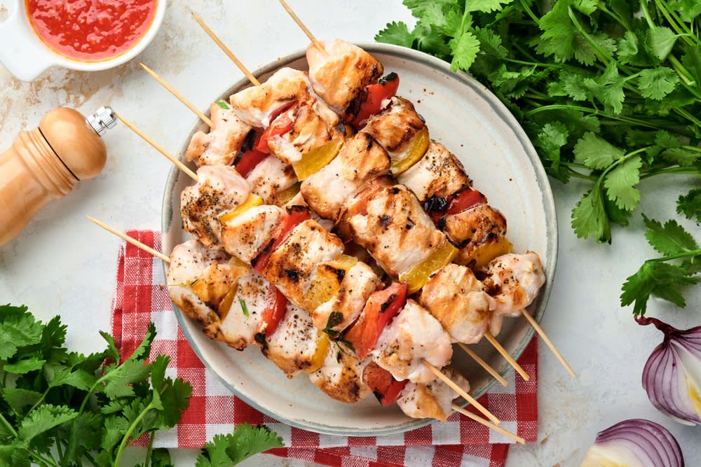Garnitură, frigăruie de pui, salată de varză, roșii, castraveți, maioneză cu usturoi, chiflă 650 g