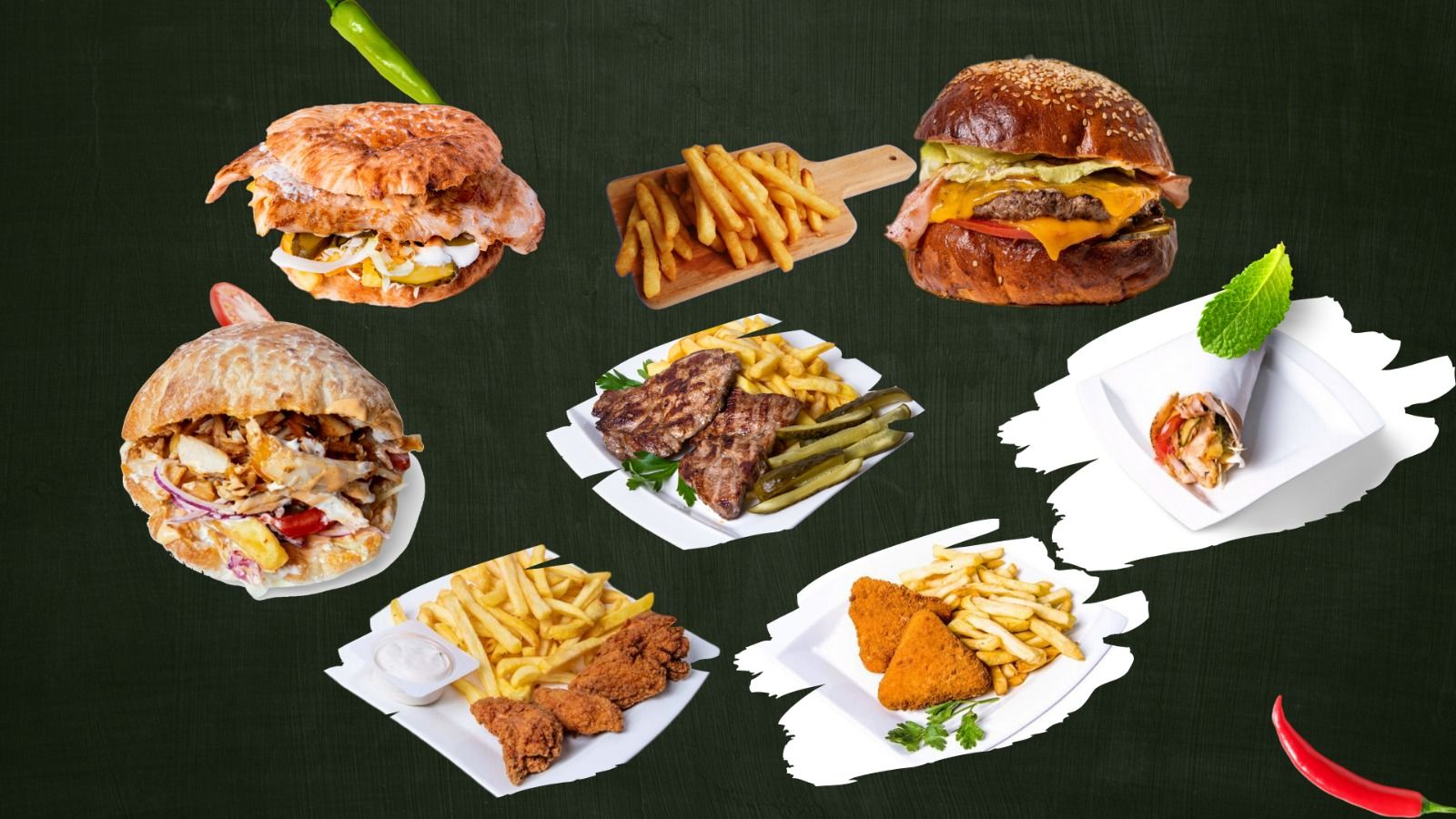 Meniu falafel, salata, ceapa rosie, rosii si garnitura la alegere. Chifla este inclusa.